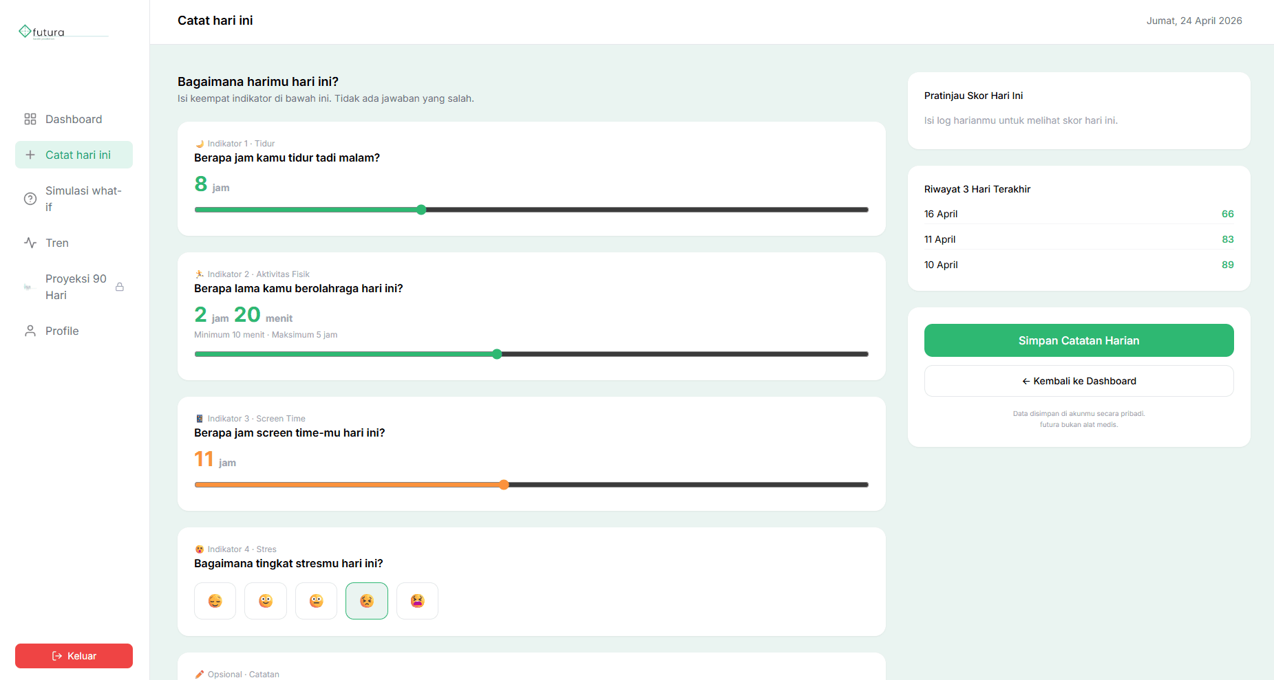 A data-driven web application that simulates the long-term impact of daily habits on user health. Utilizing a custom rule-based engine, Futura processes daily habit logs into comprehensive health scores, providing 14-day trend analysis and visual 90-day health projections.