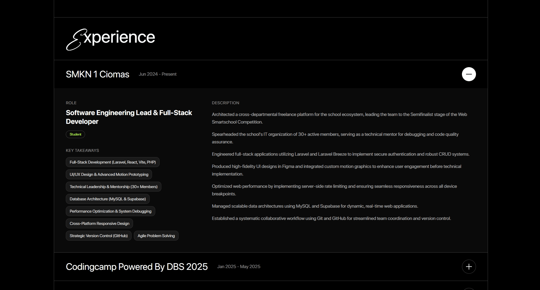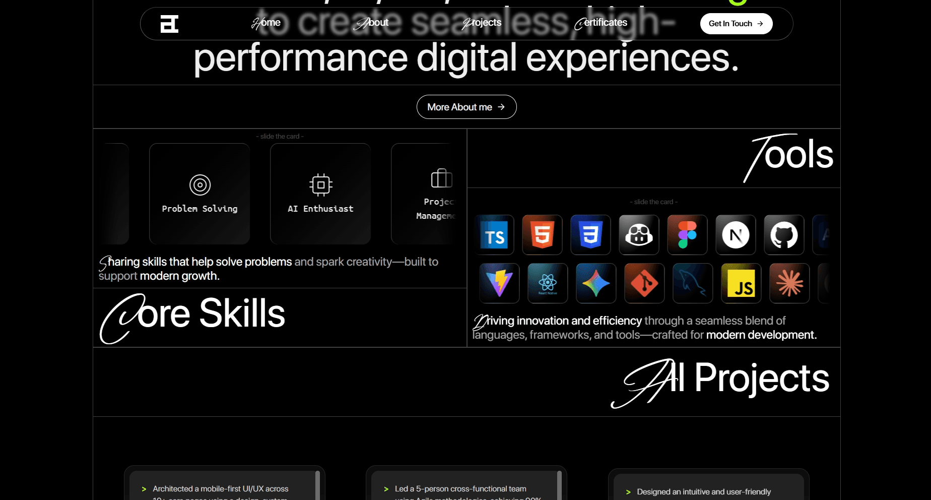 An interactive digital platform engineered to showcase my professional trajectory as a Full-Stack Developer and UI/UX Designer. Built from the ground up using modern architecture over a 5-month period, this project meticulously balances high-end visual aesthetics with technical performance, accessibility, and SEO optimization.